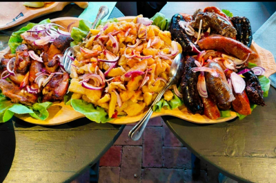 - Főétel: Kemencében, szőlővenyige parázson készült sült oldalas és sült csülök hagymás törtburgonyával és kovászos uborkával